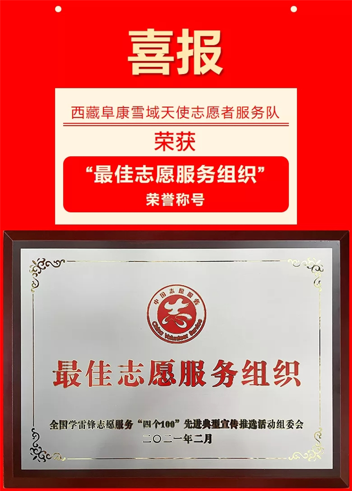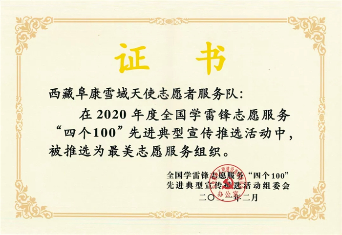 在2020年度全國學(xué)雷鋒志愿服務(wù)"四個100”先進(jìn)典型宣傳推選活動中,西藏阜康雪域天使志愿者服務(wù)隊榮獲"最佳志愿服務(wù)組織”榮譽(yù)稱號。